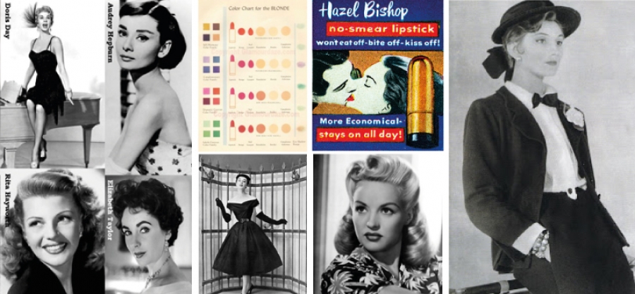 El maquillaje de la década de los 50 fue icónico y se conoce como la época del glamour. Los pasteles fueron sin duda los colores más usados en esa época junto con las tonalidades rojas de los labiales. La piel blanca y el rubor rosado vuelven a resurgir ya que las mujeres buscan delicadeza. La máscara de pestañas gana mucha popularidad junto con los delineados afelinados ya que las mujeres quieren lucir una mirada más femenina y coqueta. Como curiosidad, en 1951 dos tercios de las mujeres usaban labiales cada día y el siguiente paso de la industria del maquillaje fue inventar labiales de larga duración. Hazel Bishop inventó un labial anunciado com “labial resistente a los besos”. Elizabeth Arden, Max Factor y Helena Rubinstein fueron las marcas más relevantes durante esa década.