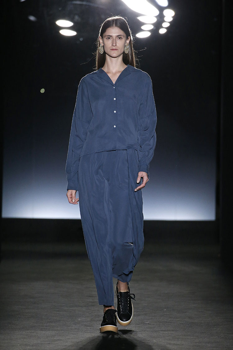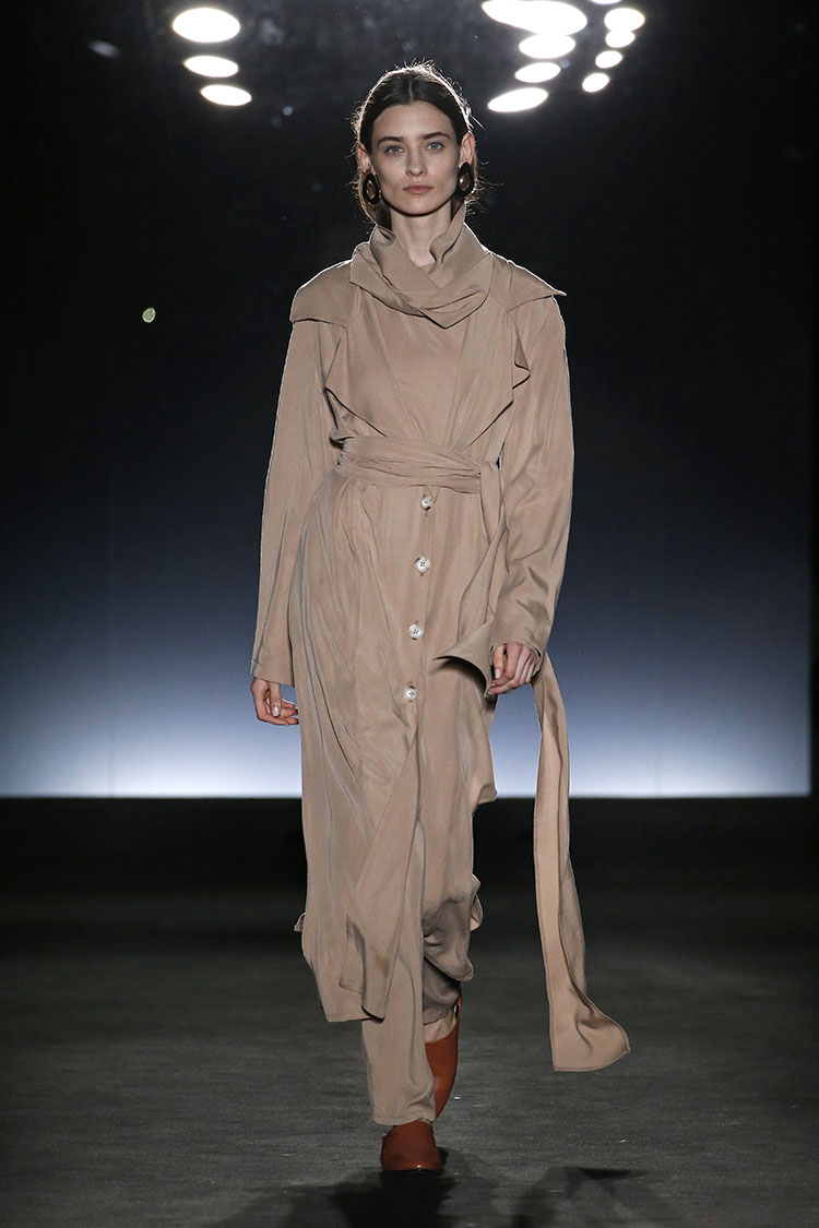 Ya no solo en esencia sino en conceptos puramente técnicos dentro de la producción. Machado consigue llegar a nuestros sentidos y lo hace utilizando tejidos lenceros, como por ejemplo el tencel o el algodón mezclados con otros que aportan más luminosidad, como el foil. Vemos looks de camisa y pantalón fluido de tencel y algodón en monocolor, tambíen vestidos camiseros y oversize que parecen acariciar la piel con delicadeza, utilizando colores neutros como el negro y los colores tierra y el estampado de rayas también en mezcla de verdes, naranjas y negros. Chaquetones en colores tierra y verde militar y trench de tencel en colores beige y negro.