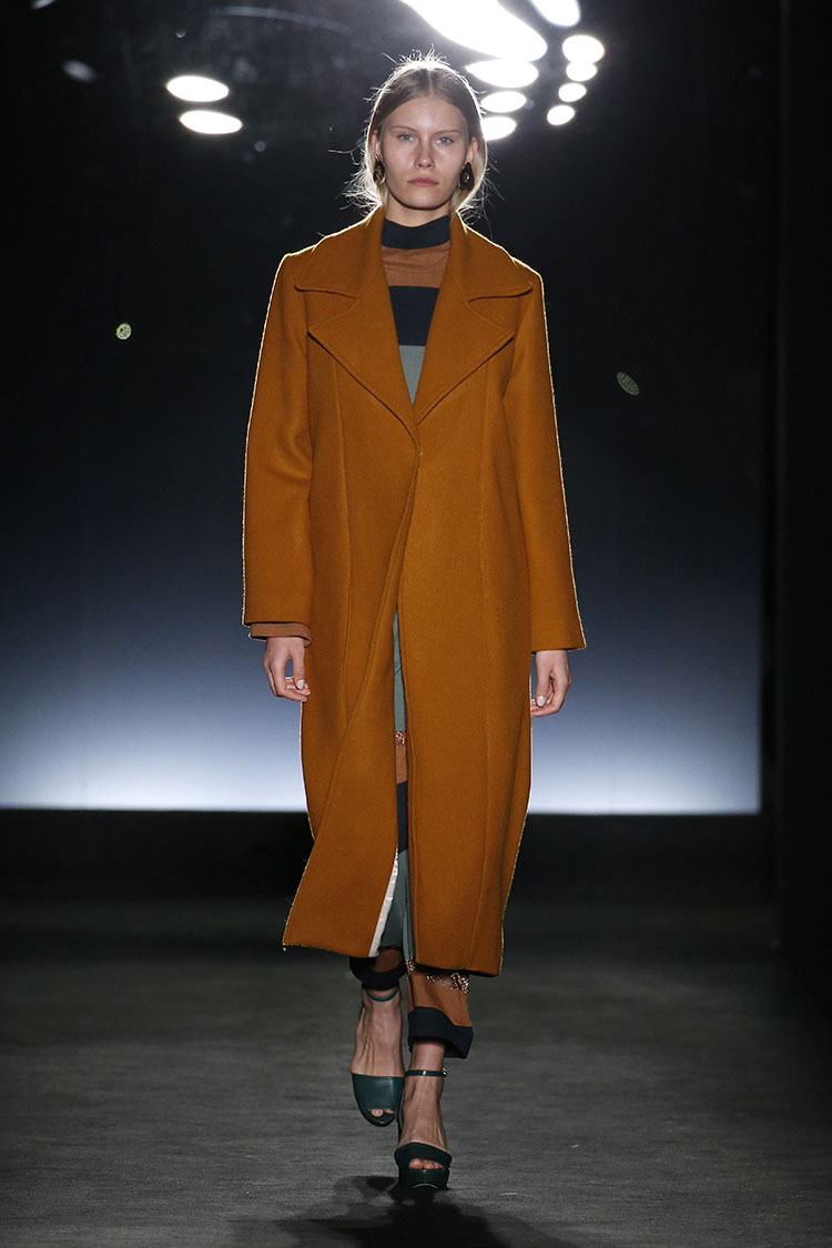 Destacan prendas estructuradas con líneas rectas, como vestidos, abrigos, chaquetas y camisas de hombros prominentes, escotes ovalados, cuadrados y con aberturas desiguales y cuellos vueltos.