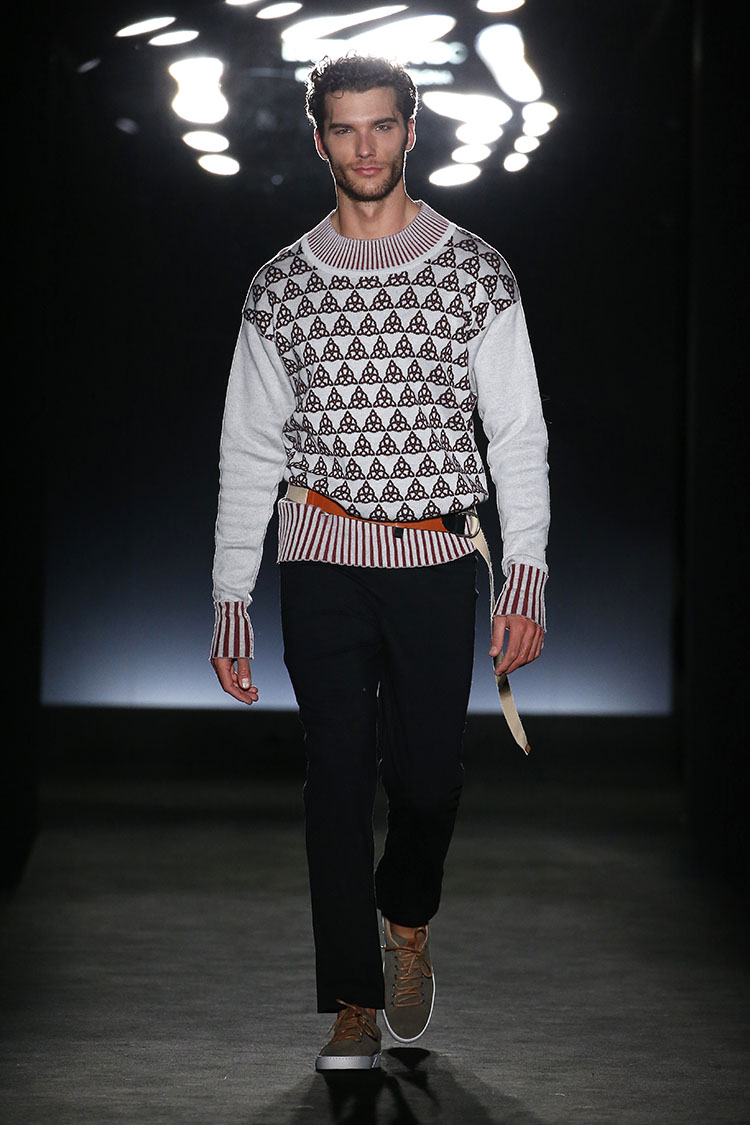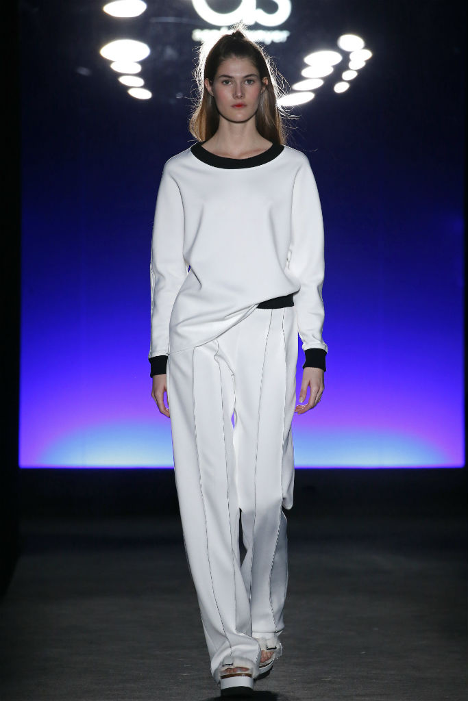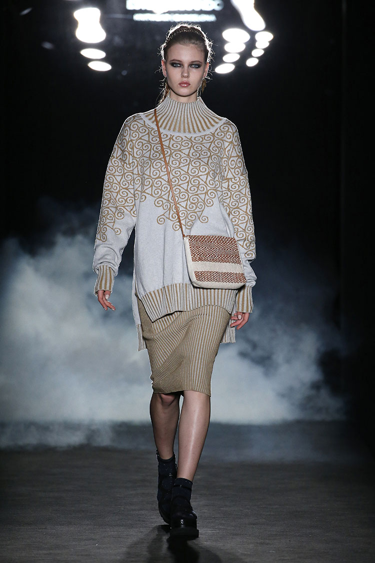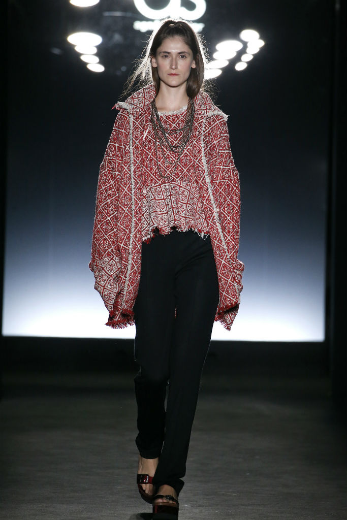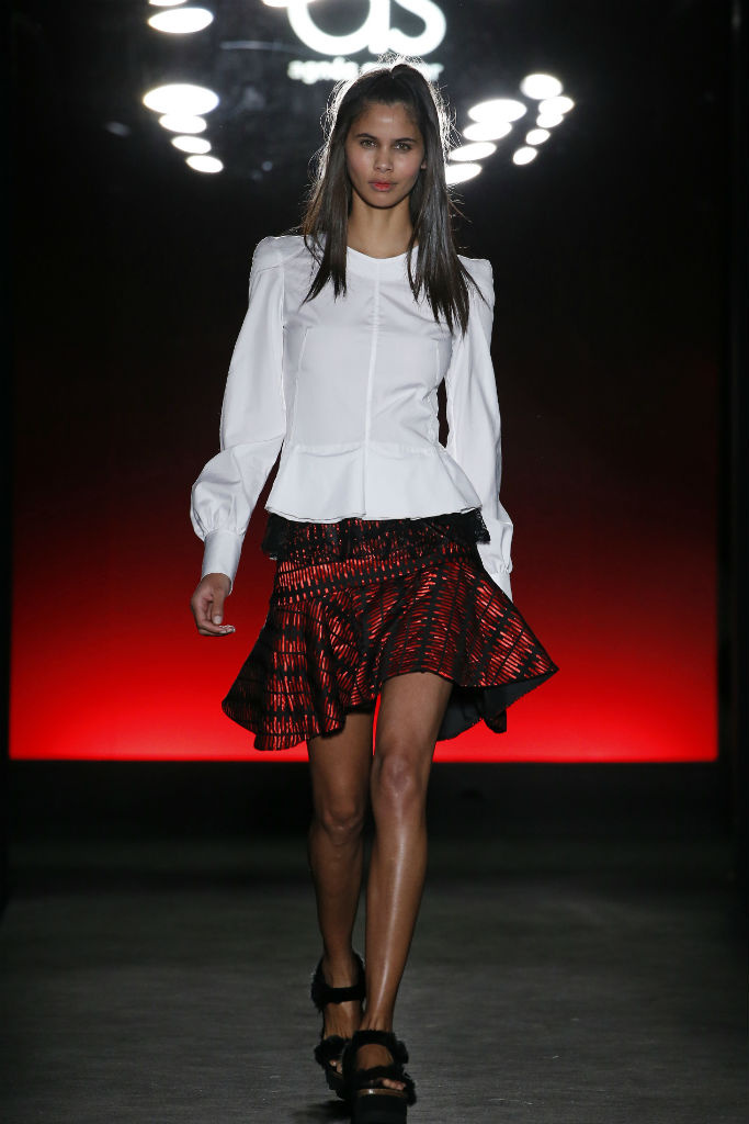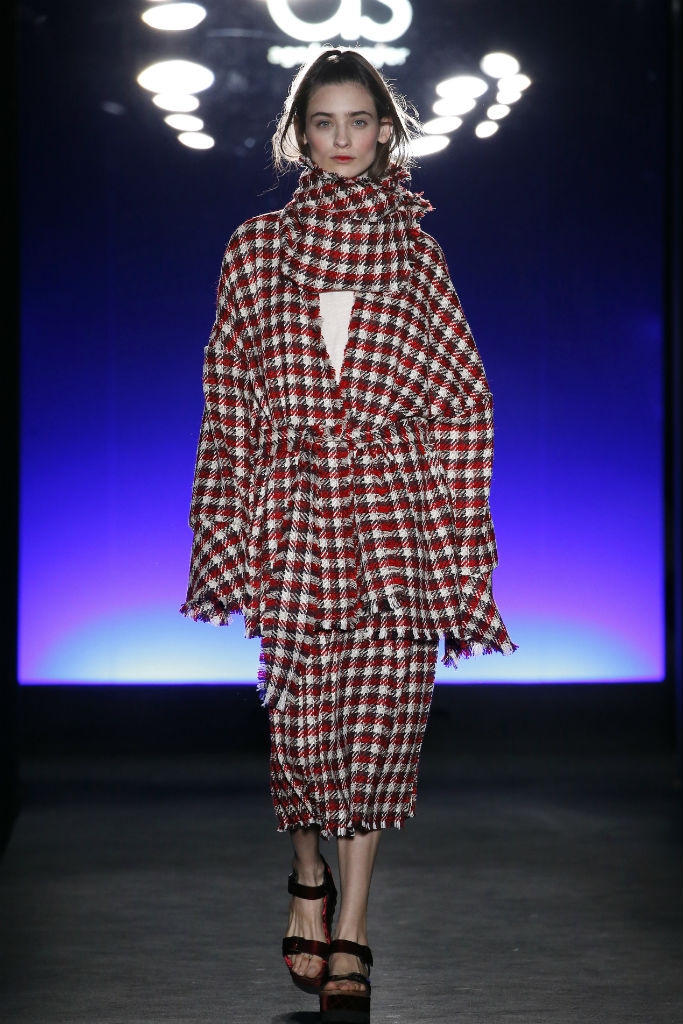 Sunyer crea looks donde se nota la influencia de la sastrería con siluetas muy marcadas pensados para la mujer trabajadora, ideales ya no solo para la oficina sino para darlo todo en cualquier terreno. En cuanto a colores es evidente la presencia de estampados de cuadros en rojo, negro y blanco que introduce en abrigos, vestidos largos y faldas con vuelo. Tambien destacan prendas de abrigo de lana de un estampado de inspiración balcánica en mezcla de colores blanco y rojo. Como accesorios encontramos bolsos versátiles en estos mismos estampados y sandalias plataforma con aplicaciones de pelo.