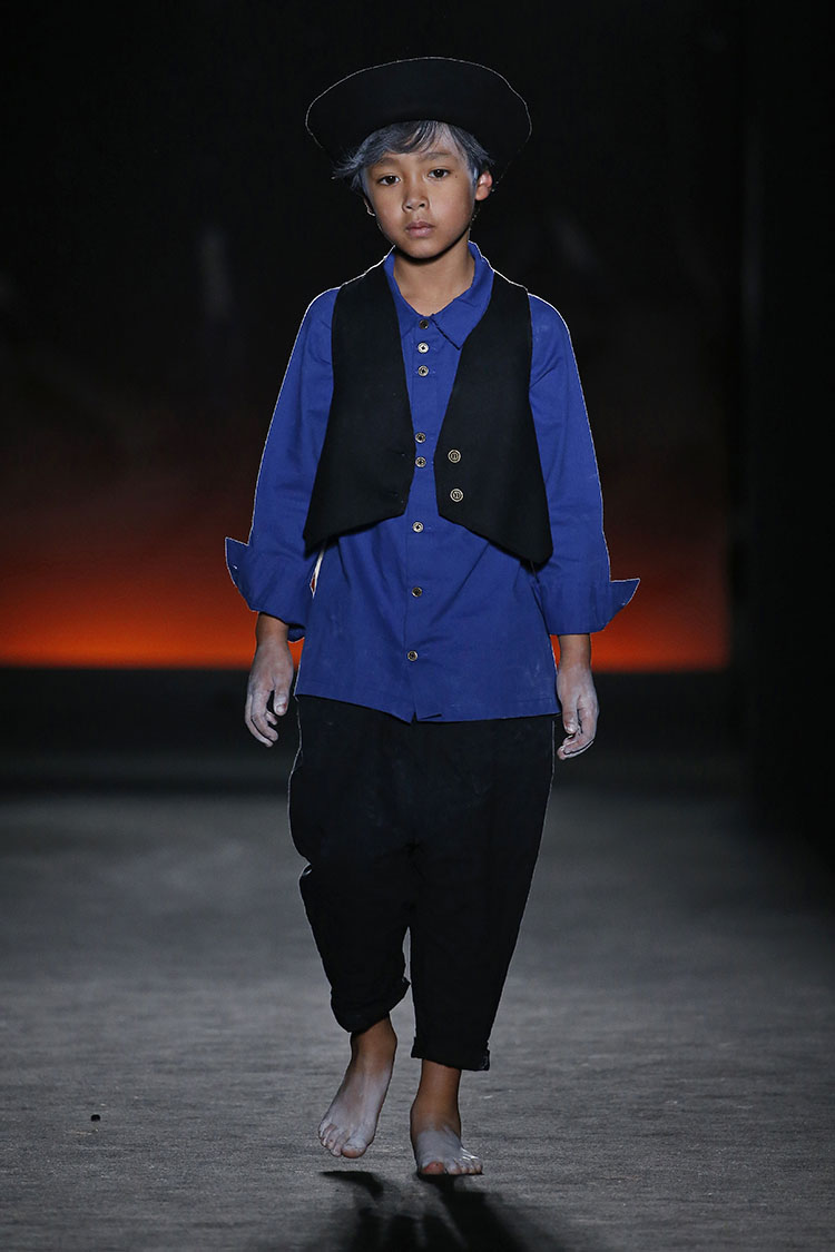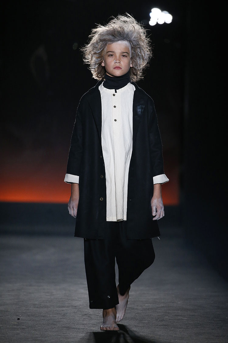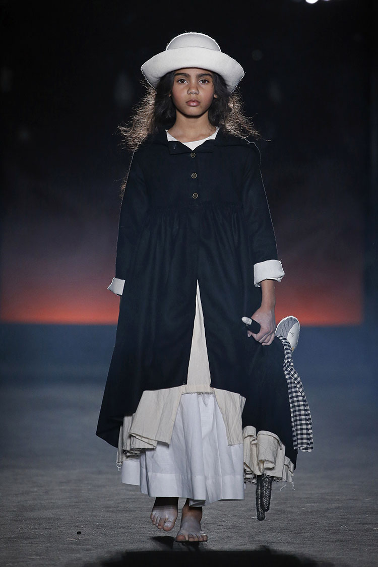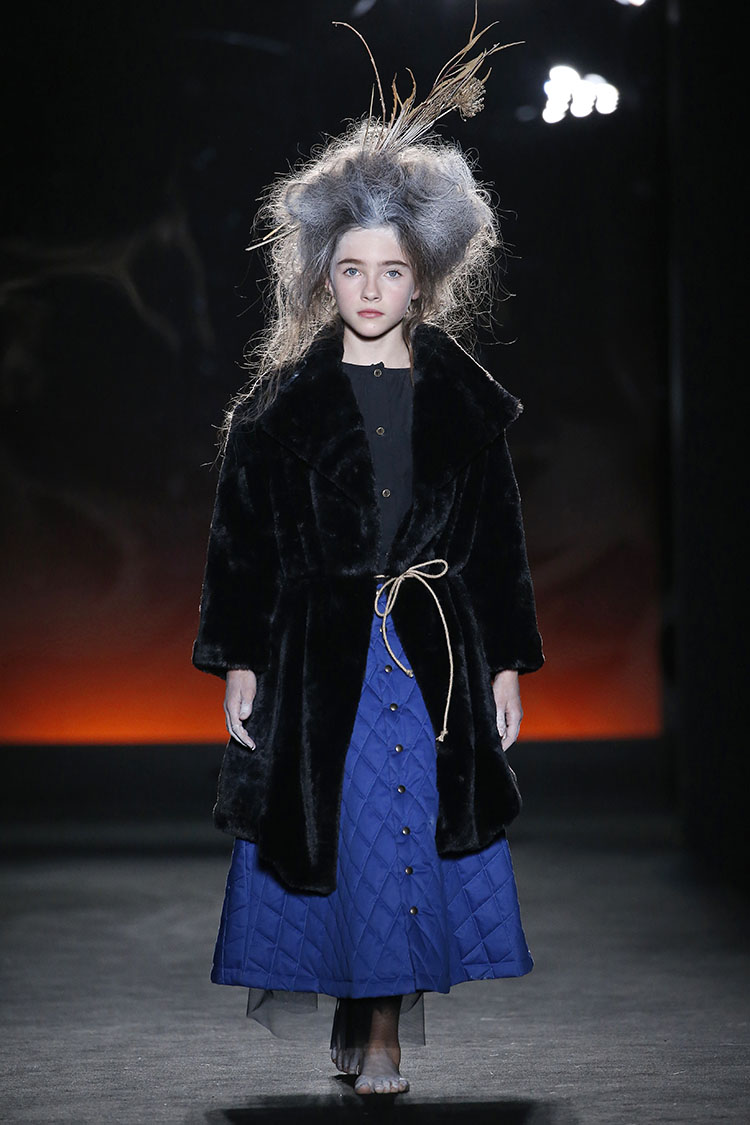 Cristina Fernandez nos presenta una colección que evoca la libertad, la esperanza y el entusiasmo de niñas y niños que tienen ante ellos un universo lleno de posibilidades. Vemos estilismos que mezclan la inocencia y delicadeza de un niño con la contraposición del paso del tiempo. Muñecas de trapo, sombreros en blanco calcáreo y pies descalzos. Pero también, cabellos blancos, peinados cardados complementados con plumas y ramas de árbol. Destacan prendas de tejidos como el lino y el algodón y una gama de tejidos acolchados que aportan volúmenes clave para la sobreposición de prendas. Estos tejidos llevan tintes naturales que consiguen colores vivos e intensos como el rojo óxido, el blanco calcáreo, el negro carbón y el azul intenso que se complementan con piezas a rayas, cuadros y estampadas. Vestidos, pichis y faldas acolchadas con abrigos de pelo para niña. Para niño Fernandez crea conjuntos de pantalones holgados y blazers sin estructura, acompañados de chalecos y tirantes. También abrigos y pantalones acolchados, chalecos y tirantes. Es sin duda una colección con la esencia de LCF que busca crear emociones ya no solo a nosotros, sino a los más pequeños cuando visten sus diseños.