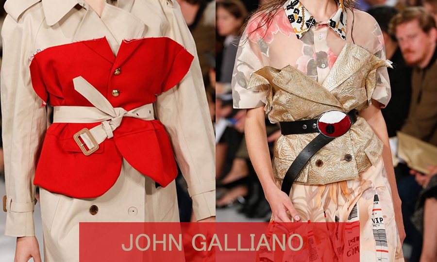 Las claves de Galliano son, por un lado, la preferencia a escoger camisas de manga corta como base -con lo que damos estructura a los hombros- y cuello cerrado, dando el toque de sastrería clásica. Y por otro, dar volumen y estructura a esta parte superior con tops o croptops de palabra de honor en tejidos Jacquard-aunque la tendencia real juega con distintos tejidos- que imiten o hagan referencia a gabardinas o abrigos.